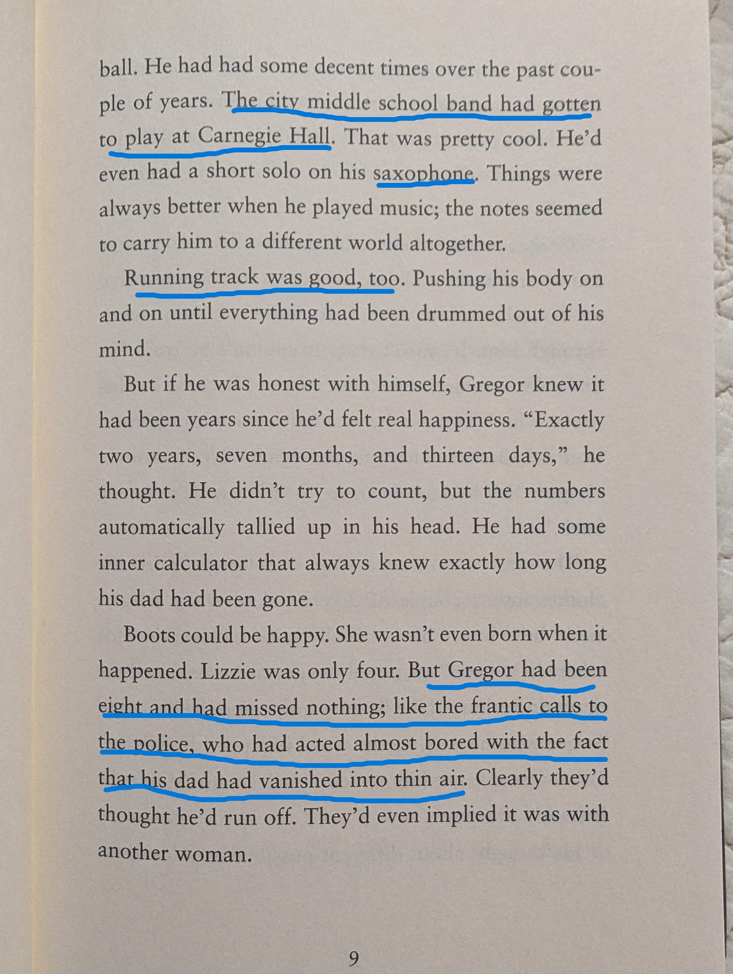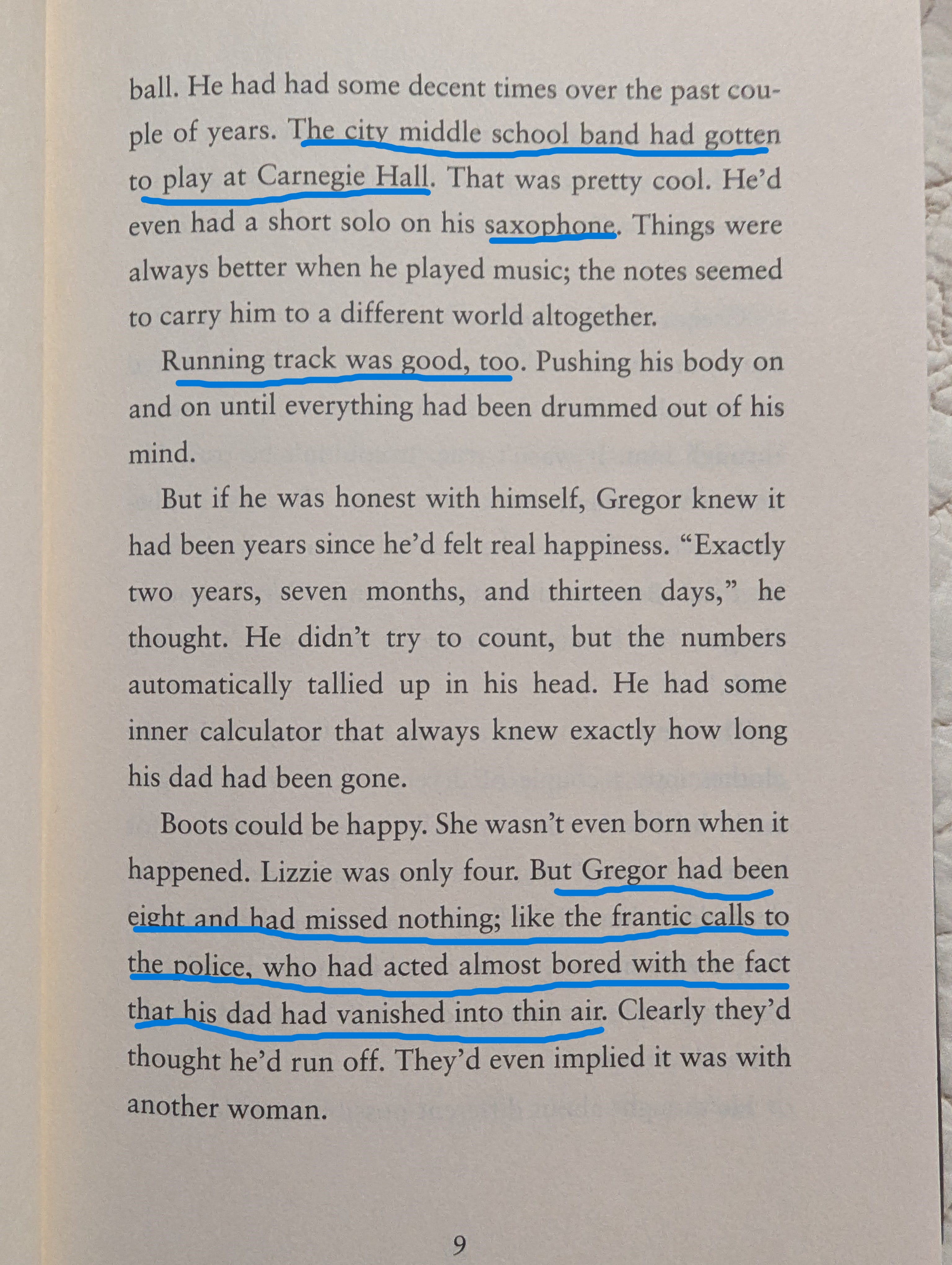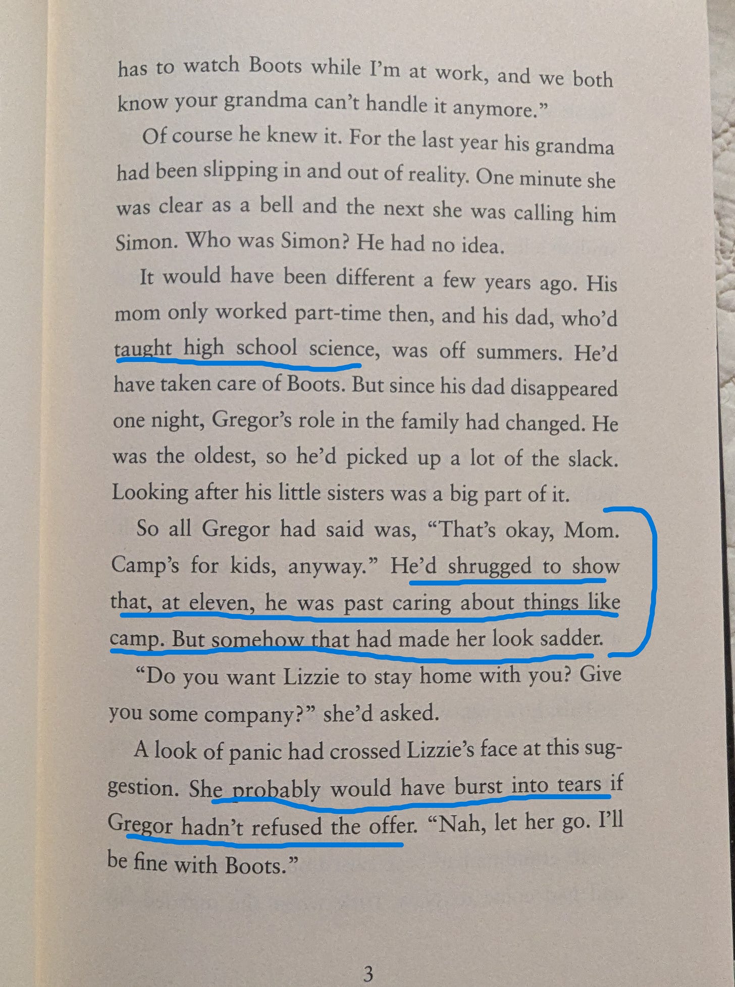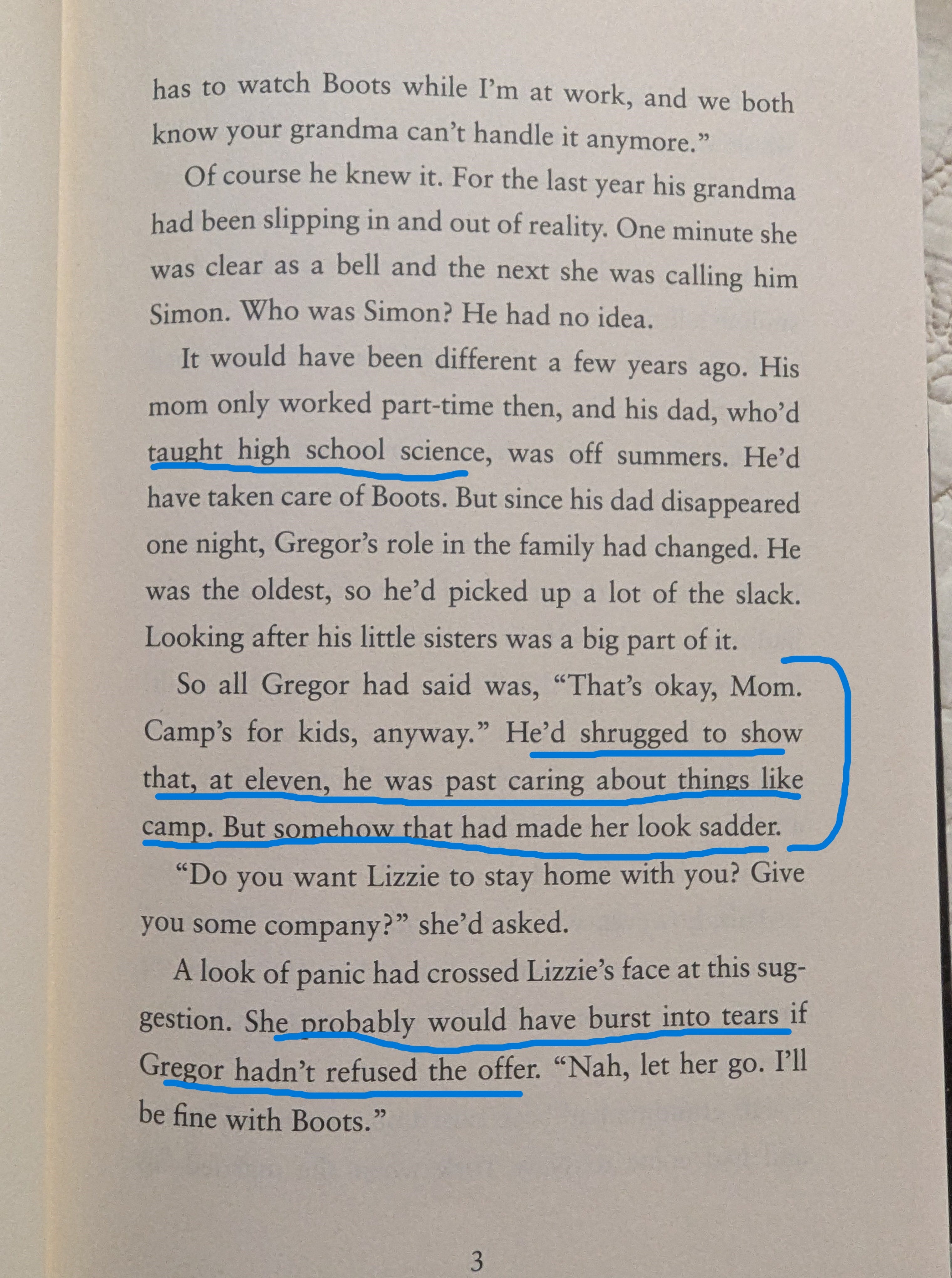 The novel opens with Gregor pressing his face against the screen door so hard it leaves marks. He frustrated (by something—we don’t know what yet, that’s the mystery!), it’s summer, and he’s hot. We quickly learn the basics of his situation: he lives in a small apartment with his mom, grandmother, and two younger sisters, Lizzie (7) and Boots (2). Only one room has air conditioning, and that is reserved for Grandma and his sisters. We learn Gregor is frustrated because he cannot go to summer camp this year because Mom needs to work full time because Dad disappeared, resulting in the loss of an income and someone to watch the kids, and grandma isn’t lucid enough to watch Boots on her own. Three pages in, we learn Gregor is only 11 himself, but very aware of how his role in the family has changed since his dad disappeared a few years ago. We see him put on a tough face for his mom and pretend he doesn’t want to go to camp and is totally fine with Lizzie being able to go to camp.